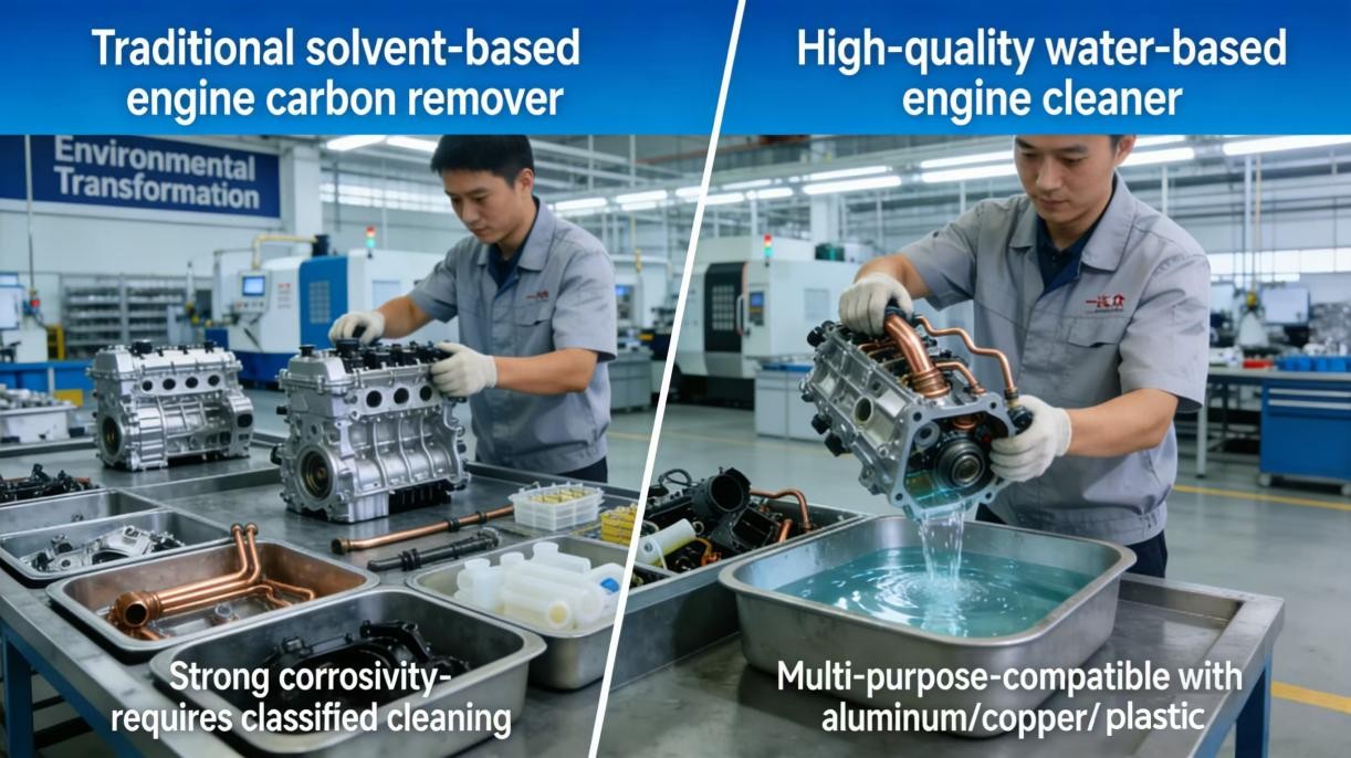 As práticas na indústria de manutenção automotiva validaram ainda mais o imperativo da transformação ambiental. A Oficina de Remanufatura de Motores FAW-Volkswagen determina explicitamente que os agentes de limpeza devem ser compatíveis com vários materiais, incluindo alumínio, cobre e plásticos, com resíduos de impurezas pós-limpeza estritamente limitados a 10mg. Os tradicionais removedores de graxa de motor à base de solvente, prejudicados por sua corrosividade agressiva, exigem limpeza em lote específica do material, resultando em uma eficiência operacional péssima. Em total contraste, os limpadores de motor premium à base de água alcançam "usos múltiplos de um produto" por meio de formulações cientificamente projetadas, atingindo um equilíbrio perfeito entre eficácia de limpeza e segurança de aplicação.